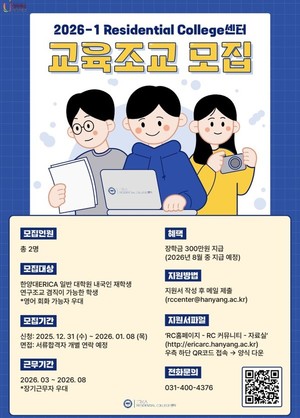 토토사이트 경찰 조회 ERICA Residential College센터에서 2026학년도 1학기 교육조교를 모집한다. 모집인원은 총 2명이며, 모집 대상은 토토사이트 경찰 조회 ERICA 일반 대학원 내국인 재학생 중 연구조교 겸직이 가능한 학생이다. 모집기간은 오는 8일까지며, 서류합격자를 대상으로 개별 통지 후 면접을 시행할 예정이다. 근무 기간은 오는 3월부터 8월까지다. 교육조교 활동 시 혜택은 장학금 300만 원이며, 2026학년도 8월 중 지급된다. 지원 방법은 RC홈페이지(바로가기)에 접속해 RC 커뮤니티 내 자료실에 있는 지원서를 작성 후 메일(