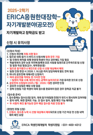 토토사이트 경찰 조회 ERICA가 2025-2학기 ‘ERICA응원한대장학(자기개발분야·교외공모전)’ 신청을 받는다. 해당 장학은 2025년 7월부터 2026년 1월까지 학술·문화·예체능 분야 교외 공모전 또는 경연대회에 참가하거나 준비한 학생을 대상으로 한다.개인 또는 팀 단위 신청이 가능하며, 팀으로 참가한 경우 대표자 1인만 신청할 수 있다. 장학금은 개인 최대 20만 원, 팀 최대 100만 원 범위에서 심사를 거쳐 차등 지급된다. 신청은 1월 9일까지 'HY-IN 포털 로그인 > 신청 > 등록 장학 > 기타교내장학신청 > ERICA응원한대