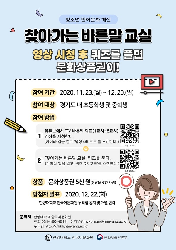 참여 방식은 ‘TV 바른말 학교(1교시~8교시)’ 교육 영상을 시청한 후 퀴즈에 응모하면 된다. ‘TV 바른말 학교(1교시~8교시)’ 교육 영상은 유튜브에서 확인할 수 있으며 퀴즈 응모 기간은 12월 20일까지이다. 정답을 맞춘 사람에게는 상품권(5천 원)을 지급한다.