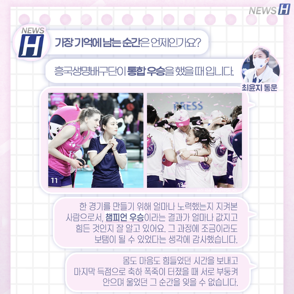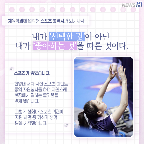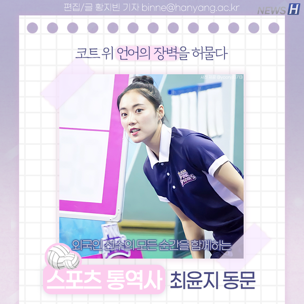 최윤지(체육학과 10) 씨는 2021 VNL 여자배구 국가대표(Volleyball Nations League 2021)의 한국 대표 통역사로 선발됐다. 최 씨는 스포츠 이벤트 통역 자원봉사를 시작으로 프로 배구단 통역사를 거쳐 국가대표 배구단 통역사로 성장했다. 스포츠 통역사는 통역뿐만 아니라 공항 픽업, 외국인등록증 발급과 같은 서류 작업 등 외국인 선수와 매시간 함께한다고 한다. 체육학과에 입학해 스포츠 통역사가 되기까지, 최 씨가 스포츠 통역사로 활동한 이야기를 카드 뉴스에 담았다. 스포츠 통역사를 꿈꾸는 한양인에게 도움이 되길 바란다.