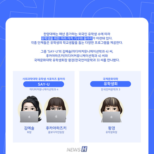 다양한 국적의 외국인 유학생이 함께 생활하고 있는 한양대, 유학생을 위한 교내 자치 기구와 동아리는 그들의 학교생활을 돕는 다양한 프로그램을 제공하고 있다. 그중 서울캠퍼스 사회과학대학 유학생 서포터즈 동아리 ‘SAY-U’와 ERICA캠퍼스 국제문화대학 유학생회의 임원진을 만나 그들의 이야기를 들었다.