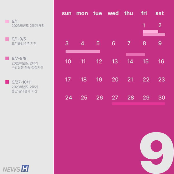 2023학년도 상반기에 이어 하반기 토토추천 파워볼사이트의 일정을 담은 카드뉴스를 준비했다. 수강 신청 기간부터 동계방학까지 학교생활에 꼭 필요한 정보들을 담았다. 어떤 일정이 있는지 살펴보고 사전에 준비해 보자.