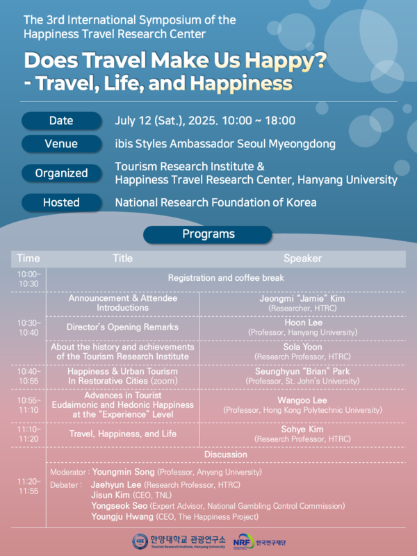 이훈 한양대 관광연구소장은 “이번 국제학술대회는 여행이 인간의 삶에 어떤 영향을 미치는지, 여행과 행복의 관계를 다양한 관점에서 조망하고 방법론적 접근을 논의하는 뜻깊은 자리였다”며, “향후에는 연구 주제별 분과를 구성해 보다 심화된 논의가 이뤄질 수 있도록 확대해 나갈 계획”이라고 전했다.