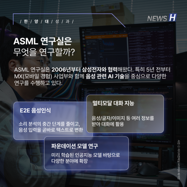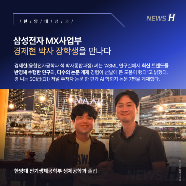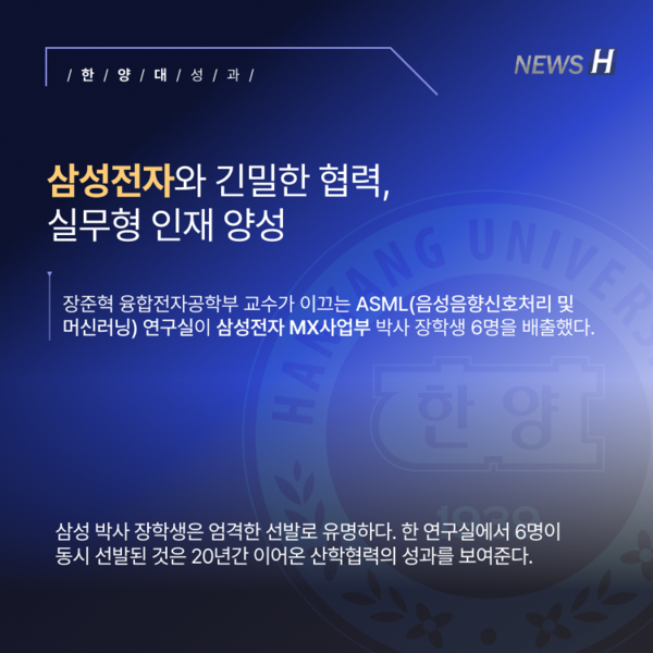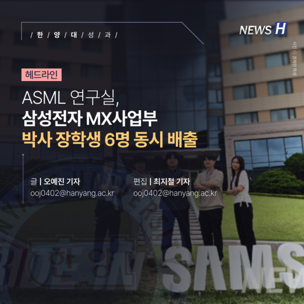 장준혁 융합전자공학부 교수가 이끄는 ASML 연구실이 삼성전자 MX 사업부 장학생 6명을 배출했다. 연구실은 2006년부터 삼성전자와의 협력을 이어오며 다양한 경쟁력을 키워냈다. 장 교수와 제자들은 AI·음성·음향 기술을 바탕으로 새로운 성과를 만들어내기 위해 꾸준히 도전하고 있다.