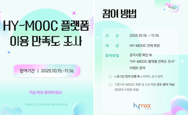 조사 기간은 11월 16일까지로, HY-MOOC에 로그인한 뒤 이벤트 공지사항에서 만족도 조사 링크를 확인하면 된다. 기존 회원뿐 아니라 신규 회원도 참여 가능하다. 설문 참여 시 페이지가 보이지 않을 경우, 로그아웃 후 HY-MOOC 메인 로그인 페이지를 통해 재접속하면 된다.