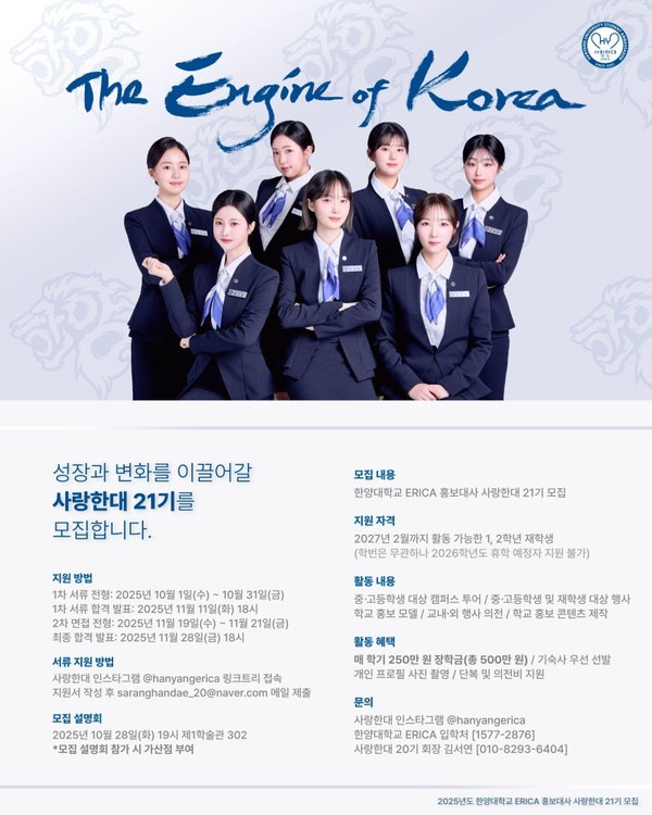한양대학교 ERICA의 대표 홍보대사 '사랑한대' 21기 모집이 10월 31일 23시 59분까지 진행된다. 지원 대상은 한양대학교 ERICA 1·2학년 재학생으로, 2026학년도 휴학 예정자는 지원할 수 없다. 1차 서류전형과 2차 면접전형을 거쳐 선발될 예정이다.