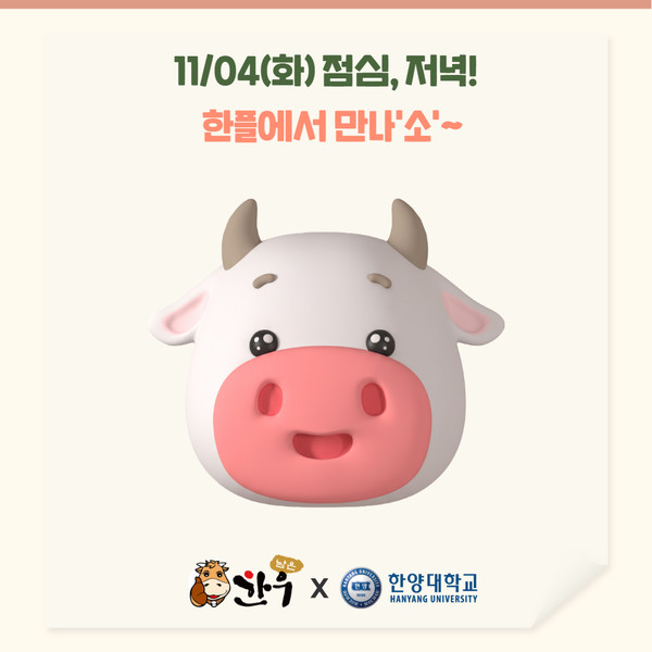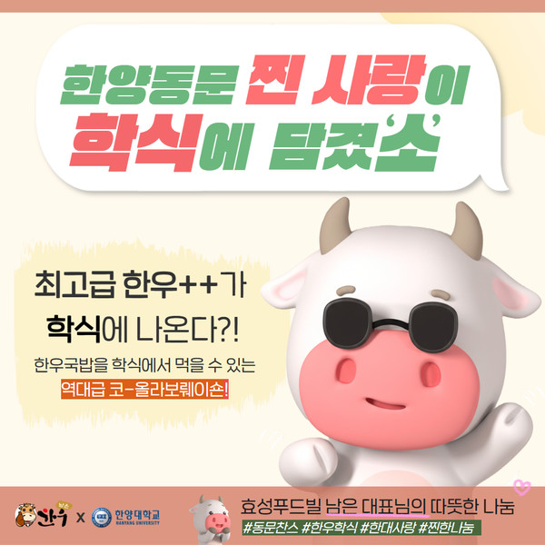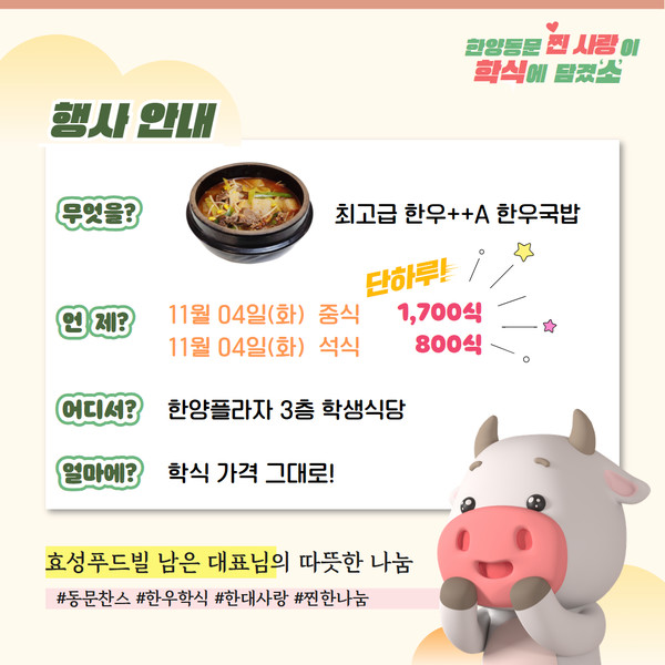 한양대학교 서울캠퍼스 한양플라자 3층 학생식당에 오는 11월 4일(화), 특별한 식사가 오른다. 국제관광대학원에 재학 중인 남은 효성푸드빌 대표(국제관광대학원 23)가 학교에 1++(투플러스) 한우 약 350kg을 현물로 기부하며 마련된 행사다. 자세한 내용을 카드뉴스로 만나보자.