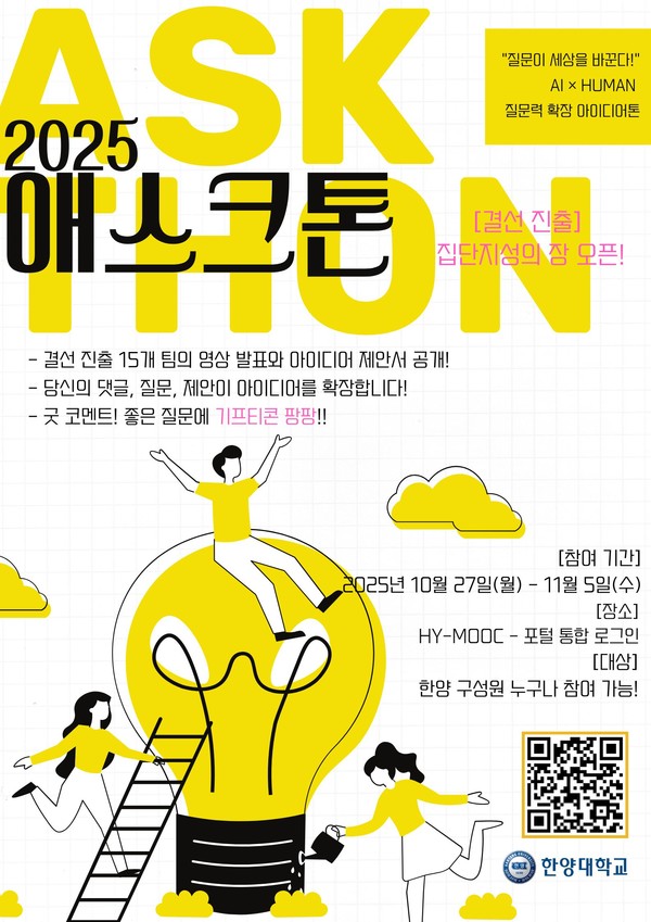 한양대학교 AI융합교수학습팀이 주관하는 '2025 애스크톤(Asththon)'이 HY-MOOC 플랫폼에서 열린다. 애스크톤은 AI × Human 질문력 향상 대회로, 함께 질문하고 사고하는 것을 목표로 한다. HY-MOOC에는 치열한 경쟁 끝에 결선까지 진출한 15개 팀의 발표 영상이 공개된다.