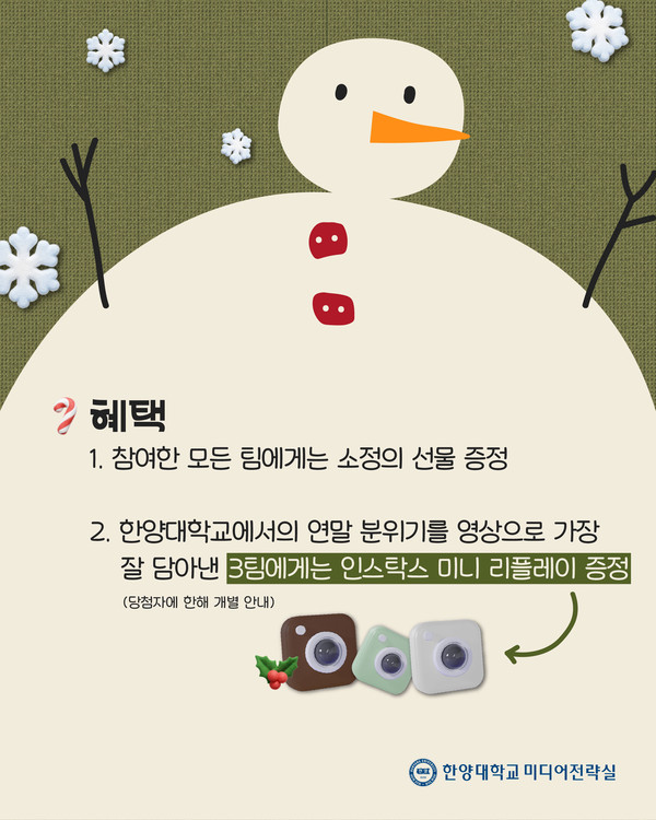 학생·교수·직원 등 한양대 구성원이라면 누구나 참여 가능하다. 주제는 ▲올해 한양대에서 가장 기억에 남는 순간 ▲한양대에서 가장 행복했던 순간 ▲한양대에서 연말을 보내는 방법 중 하나를 선택할 수 있다.