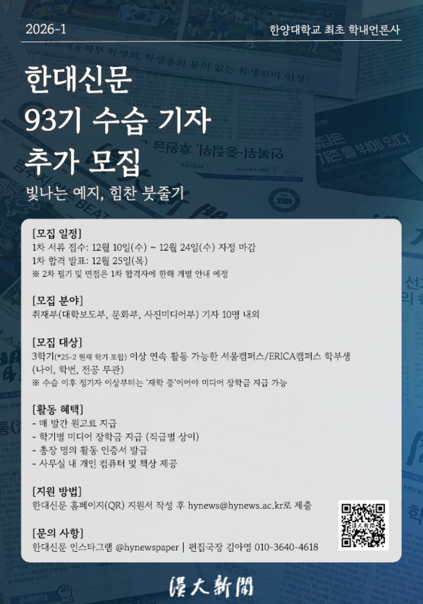 한양대학교 학보사 한대신문이 93기 수습기자를 추가 모집한다. 모집 분야는 취재부 기자로, 대학보도부·문화부·사진미디어부에서 활동할 인원 10명 내외를 선발할 예정이다.