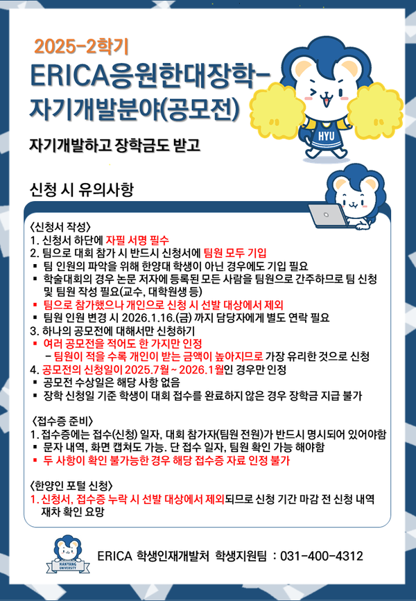 개인 또는 팀 단위 신청이 가능하며, 팀으로 참가한 경우 대표자 1인만 신청할 수 있다. 장학금은 개인 최대 20만 원, 팀 최대 100만 원 범위에서 심사를 거쳐 차등 지급된다. 신청은 1월 9일까지 'HY-IN 포털 로그인 > 신청 > 등록 장학 > 기타교내장학신청 > ERICA응원한대 장학 신청' 단계로 가능하다. 선발 결과는 1월 28일 이후 ‘기타교내장학신청-신청상태’에서 확인할 수 있다. 장학금 지급은 1월 30일 예정이다.