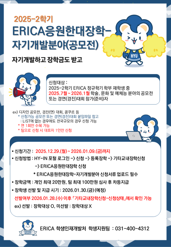한양대 ERICA가 2025-2학기 ‘ERICA응원한대장학(자기개발분야·교외공모전)’ 신청을 받는다. 해당 장학은 2025년 7월부터 2026년 1월까지 학술·문화·예체능 분야 교외 공모전 또는 경연대회에 참가하거나 준비한 학생을 대상으로 한다.