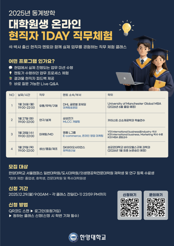 한양대학교가 2025년 동계방학을 맞아 ‘대학원생 온라인 현직자 1DAY 직무체험 클래스’를 운영한다. 이번 프로그램은 석·박사 과정 출신 현직자 멘토와 함께 실제 업무 프로세스를 체험하고 직무 미션을 수행하며, 현업 전문가의 피드백을 받을 수 있도록 기획됐다.