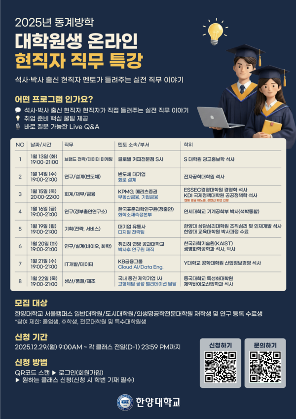 한양대학교가 2025년 1월 13일(화)부터 1월 22일(목)까지 ‘대학원생 온라인 현직자 직무 특강 시리즈’를 운영한다. 이번 특강은 석·박사 과정을 마친 후 현업에서 활동 중인 직무별 현직자가 직접 참여해 실전 직무 이야기와 취업 준비 핵심 전략을 공유하는 프로그램이다.