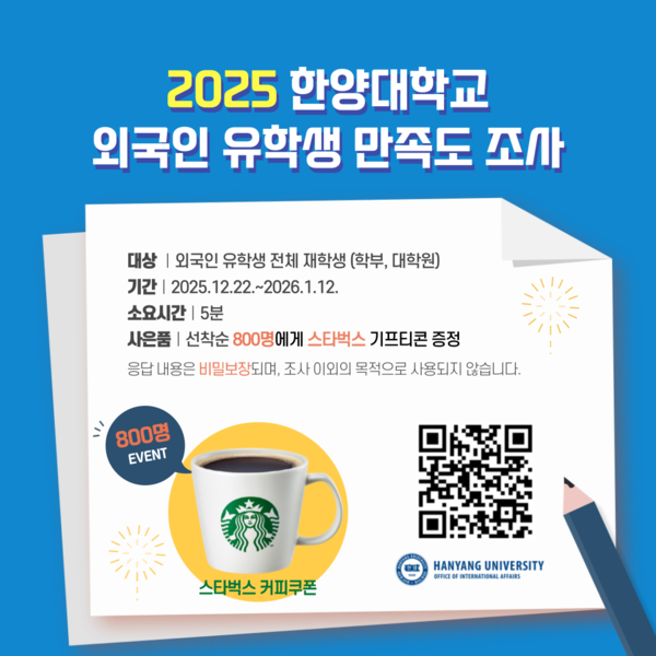 참여는 포스터 내 QR 코드 스캔 또는 온라인 설문 링크(https://survey.panel.co.kr/HYU1)를 통해 가능하다. 외국인 유학생들의 적극적인 참여를 바란다.