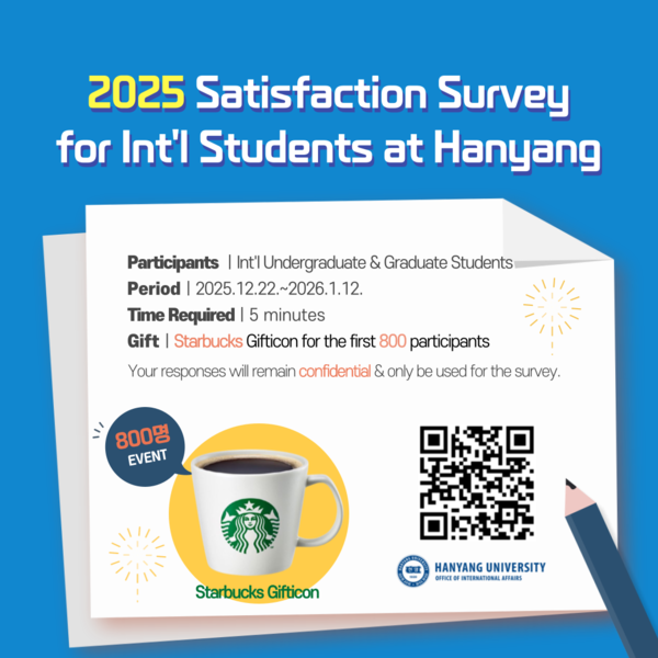 한양대학교 국제입학팀이 외국인 유학생의 학업 및 캠퍼스 생활 지원 강화를 위한 만족도 조사를 실시한다. 이번 조사는 서울캠퍼스 재학 중인 외국인 유학생(학부·대학원) 전체를 대상으로 하며, 응답 소요 시간은 약 5분이다.