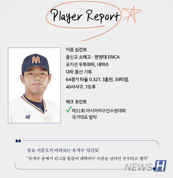 말주변이 좋은 선수는 아니지만 심건보에게 느껴지는 에너지는 성실함과 우직함, ‘뚝심’ 있는 야구선수다. 두산베어스가 오랫동안 보여온 뚝심 야구에 가장 잘 어울리는 선수일지도 모르겠다. 9라운드 지명으로 다소 후발지명이었지만 수많은 리포팅이 분석하듯 심건보가 지명받은 데는 다 그만한 이유가 있다. 심건보는 실전에서 대주자로도 즉시 투입할 수 있을 만큼 준비된 선수다. 한양대에서 4번타자로 활약했던 경험은 장타에 대한 가능성을 시사하게 한다. 한양대에서 졸업을 앞둔 심건보에게 4년의 학부시간은 그를 키운 중요한 시간이었을 터다. 고교 시절 드래프트에서 고배를 맛본 이후 오히려 마음의 조급함과 부담이 덜어졌다고.