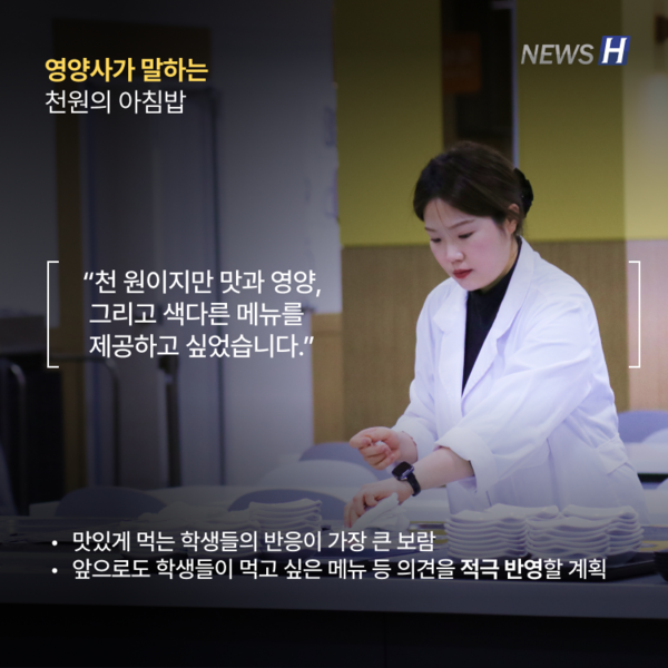 인생한방 토토사이트가 학생 복지의 일환으로 참여 중인 천원의 아침밥 사업이 지난달 12일 농림축산식품부의 우수 사례 선정 심사에서 장관상을 받았다. 천원의 아침밥은 학생들의 식비 부담을 덜기 위해 1000원으로 아침 식사를 할 수 있도록 농림축산식품부가 주관하는 사업이다. 인생한방 토토사이트는 2023년과 2024년 시험 운영을 거쳐 지난해부터 천원의 아침밥 사업에 상시 참여하고 있다. 맛과 영양은 물론 이색 식단 기획에 이르기까지, 인생한방 토토사이트와 숨은 주역들의 땀방울이 어떻게 공식적인 성과로 이어졌는지 카드뉴스를 통해 살펴보자.