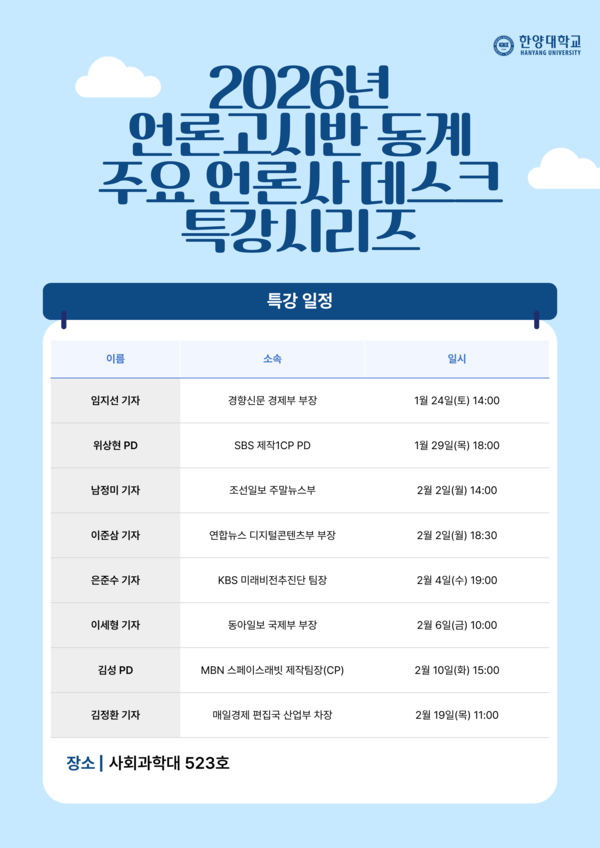 한양대학교 언론고시반이 재학생을 대상으로 ‘2026년 동계 주요 언론사 데스크 특강 시리즈’를 개최한다. 이번 특강은 언론 현장에 대한 실질적인 이해를 돕고, 언론사 입사를 준비하는 학생들에게 구체적인 진로 정보를 제공하기 위해 마련됐다.