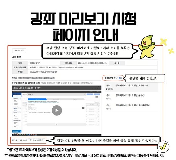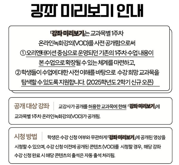 ‘강좌미리보기’는 교과목별 1주차 온라인 녹화강의를 사전 공개함으로써, 오리엔테이션 중심으로 운영되던 기존 1주차 수업 내용을 실제 본수업으로 확장할 수 있는 기반을 마련하고, 학생들이 수업에 대한 사전 이해를 높이도록 지원하는 제도다. 2025학년도 2학기부터 신규 오픈되어 본격 운영된다.