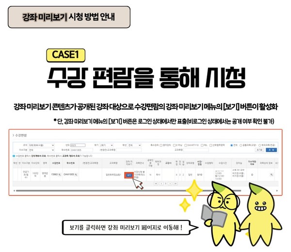첫째, 수강편람을 통한 시청이다. 강좌미리보기 콘텐츠가 공개된 강좌의 경우, 수강편람 내 ‘강좌미리보기’ 메뉴의 ‘보기’ 버튼이 활성화된다. 로그인 상태에서 ‘보기’를 클릭하면 강좌 미리보기 페이지로 이동해 영상을 시청할 수 있다.