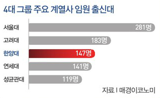 경제 주간지 매경이코노미도 지난 6월 4대 그룹 주요 계열사의 전무 이하 임원들의 출신 대학을 조사했다. 우리대학은 1,921명 중 147명으로 서울대, 고려대에 이어 3위에 올랐다. 매경이코노미는 특히 자동차, IT 등 주요 기업들의 한양대 출신 임원들이 많은 점은 이공계 출신 임원들이 늘어나는 것과 일맥상통한다고 밝혔다.