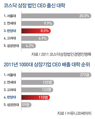 지난 7월 코스닥협회와 한국상장회사협의회가 발간한 ‘2011 코스닥상장법인경영인명록’에 따르면 올해 7월 1일 기준으로 1,024개사 코스닥 상장법인 CEO 1,241명의 출신 대학 조사에서 우리대학은 8.5%로 3위를 차치한 것으로 나타났다. 2002년 이후로 줄곧 우리대학이 서울대, 연세대와 함께 상위권을 차지하고 있으며, 일간지 헤럴드 경제 7월 20일자에서 “SKY가 아니라 SYH”라고 할만큼 우리대학 CEO 동문들의 활약이 돋보인다. 2008년 10.4%로 2위, 2009년 8.8%로 2위, 2010년 8.7%로 3위를 차지하며 코스닥에서 강한 면모를 보이고 있는데 우리대학의 공대 동문들이 대기업에 입사해 기술을 연구하다 창업하는 경우가 증가하면서 높은 순위에 오르고 있는 것으로 분석된다.