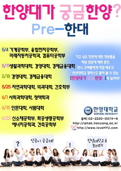 일정별로 전공 배정 현황을 보면 △ 5월4일에는 기계공학부, 융합전자공학부, 미래자동차공학과, 컴퓨터공학부 △ 5월 11일에는 생활과학대학, 경영대학, 경제금융대학 △ 5월 18일에는 경영대학, 경제금융대학 △ 5월 25일에는 자연과학대학, 의과대학, 간호학부 △ 6월 1일에는 사회과학대학, 정책학과 △ 6월 15일에는 인문대학, 사범대학 △ 6월 22일에는 신소재공학부, 화공생명공학부, 에너지공학과, 건축공학부가 배정되어 있다. 신청은 입학처 홈페이지(http://iphak.hanyang.ac.kr )를 통해 가능하다.