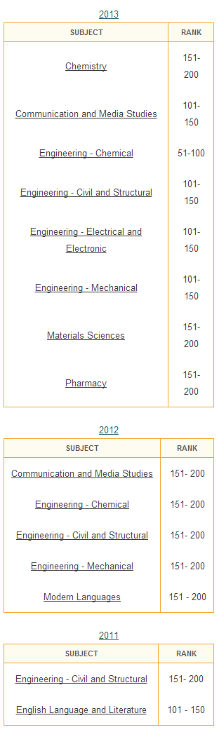 한편 'QS 세계 대학 평가 학문 분야별 순위'는 ▲학계 평가 ▲졸업생 평판도 ▲교원당 논문 인용 수 ▲H인덱스 등 네 가지 지표를 가지고 전 세계 2858개 대학을 평가 후, 30개 학문 분야별로 200위까지 순위를 매긴다. 이때 1위부터 50위까지는 개별 대학 명단이 나오지만, 51위 부터는 51위~100위,101~150위, 151~200위 이런식으로 50개씩 묶어서 발표한다. 2013 QS 세계대학평가 결과는 오는 9월경에 발표될 예정이다.