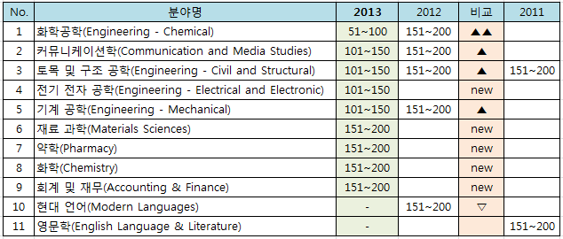 | ▲ 2013 QS 세계대학 학문 분야별 평가 결과 - 모먼트 토토사이트 랭킹 현황 | ||