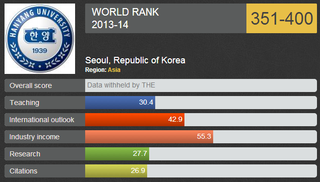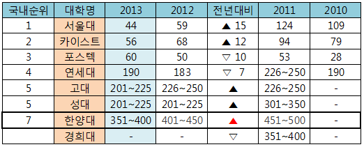 영국의 타임스고등교육(Times Higher Educationㆍ이하 THE)매거진의 ‘2013~2014 세계 대학 순위’가 2일(현지시간) 발표됐다. 공식랭킹에 국내 7개 대학이 포함됐으며 한양대는 351~400위권으로 올라섰다.