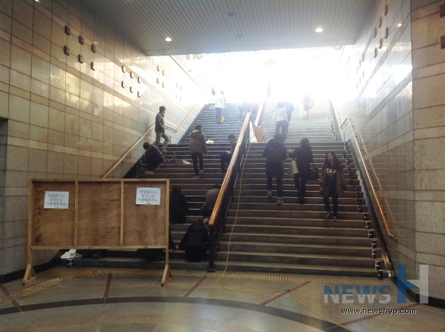 ▲ 일요일임에도 불구하고 많은 사람들이 통행하는 상황이어서 불편함이 없도록 하기 위해 한쪽 계단씩 순차적으로 진행되었다. |