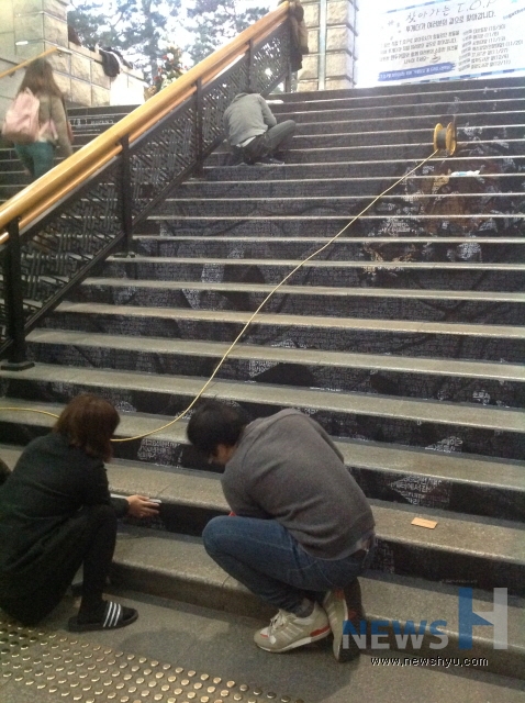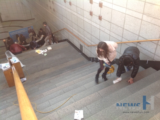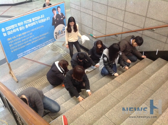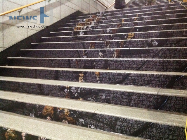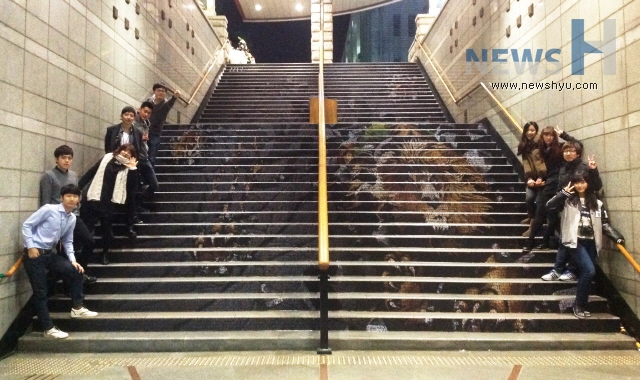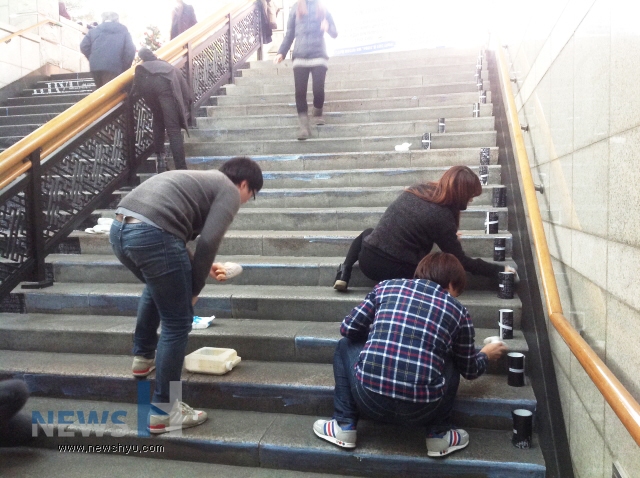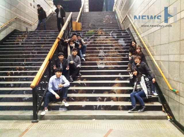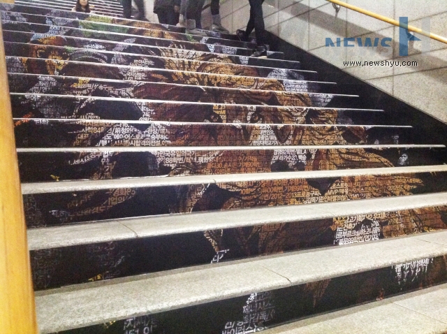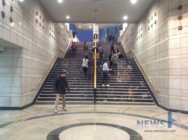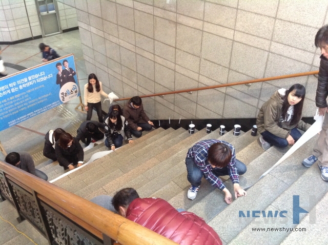 한양브랜드서포터즈 프로젝트 팀 중 '한양 동문 홍보 주간'을 통해 동문에 대한 자부심과 대학 홍보를 강화하고자 진행한 '한양, 74인의 영리더를 말하다' 팀이 지하철 애지문 계단에 독특한 홍보를 진행하고 있다.