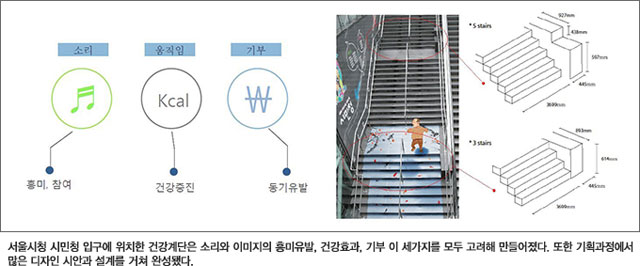 건강계단 또한 사전조사를 바탕으로 했다. 시민청에 설치된 계단과 에스컬레이터 사용자를 3일 간 분석, 95%가 넘는 사람들이 에스컬레이터를 이용한다는 것을 파악했다. 이에 연구팀은 계단 사용을 늘리고 동시에 비만을 예방할 수 있는 방법을 모색했다. 먼저 시각적으로 시민들을 사로잡기로 했다. 현 웹툰사이트 토토사이트 디자인팀은 서울과 주변 공간이 가지고 있는 상징성을 바탕으로 우리나라 고유의 디자인을 적용하기로 했다. 무병장수를 의미하는 십장생을 계단의 최종 디자인으로 결정했다. 또 계단을 밟으면 가야금 소리가 나게 함으로써 우리나라 고유의 멋을 느낄 수 있는 계단이 탄생했다.