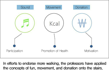 With the launch of the musical stairs, people soon gained interest in the intriguing new stairway and enjoyed making sound with movements, donating as they ascended up and down the stairs. Professor Lee commented, "The Fun Theory has been applied to the project, which indicates that fun obviously can change behavior for the better." He added that due to living hectic lives, people have less time for a regular workout; therefore, it became natural to think about how to successfully make the most of spare time, such as time spent for commuting, to exercise. Professor Hyun continued, "It was very difficult to think of the design for the stairs. The local government wanted it to be traditionally Korean style, but as neighboring Asian cultures somehow overlap the Korean one, it was tough to choose one design that would solely fit Korean identity."