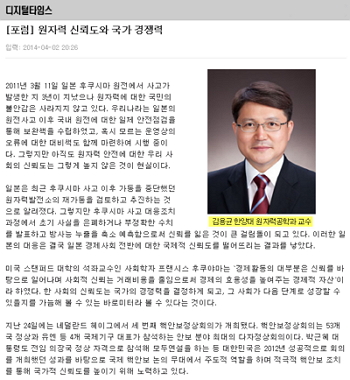 3일자 <디지털타임스>에는 김용균 원자력공학과 교수가 원자력 신뢰도에 관한 기고글을 전했습니다. 김 교수는 기고글에서 "한 사회의 신뢰도는 국가의 경쟁력을 결정하는 바로미터"라고 말했는데요. 이와 관련해 지난 핵안보정상회의에서 우리 원천기술이 적용된 공동 프로젝트를 선언한 것은 한국의 원자력 신뢰도를 높일 수 있는 기회라고 언급했습니다. 김 교수는 "세계 핵안보에 우리 기술력을 앞세워 함께 하게 된 것은 국제 사회의 신뢰를 얻기 위한 기술적 노력의 개가"라며 "신뢰도를 한층 높여 국가경쟁력을 더욱 강화해야한다"고 조언했습니다.