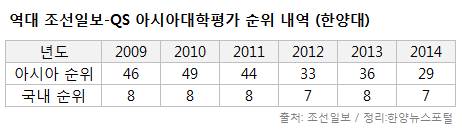 12일 조선일보가 영국의 대학평가 기관인 QS와 함께 '2014 조선일보-QS 아시아 대학평가' 결과를 발표했다. 이 평가발표는 올해로 6번째다. 한양대는 29위로 지난해 36위보다 7계단이나 올라 '약진'했다. 국내 대학 중에는 7위, 사립대 중에서는 4위에 위치했다.