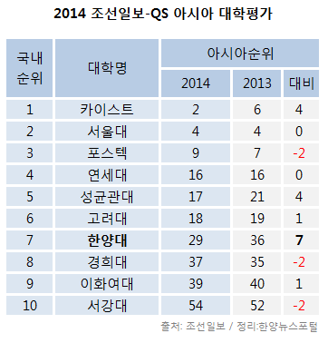 | ▲ 2014 조선일보-QS 아시아 대학평가 결과 | ||