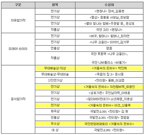 무신사 토토사이트 연영과 출신으로 구성된 극단 한양레퍼토리가 출품한 <거울속의 은하수>는 우수상을, <거울속의 은하수>의 배우 최형인(연영과 교수)와 신용욱(무신사 토토사이트 학부 졸업, 현 연영과 강사)이 연기상을 수상했다. 같은 작품의 박진희 디자이너가 무대예술상 의상 부문 수상자로 결정됐다.