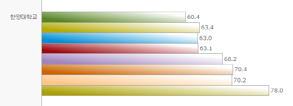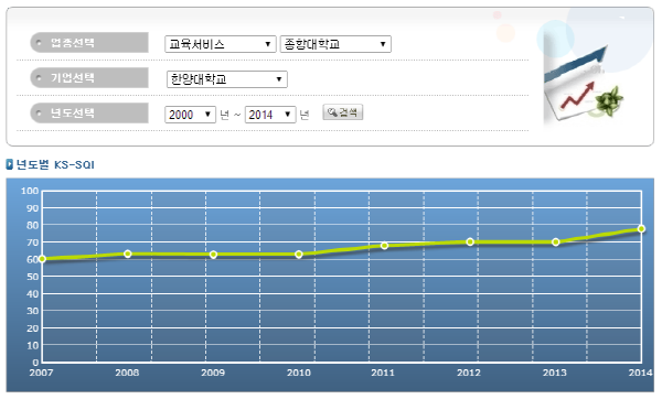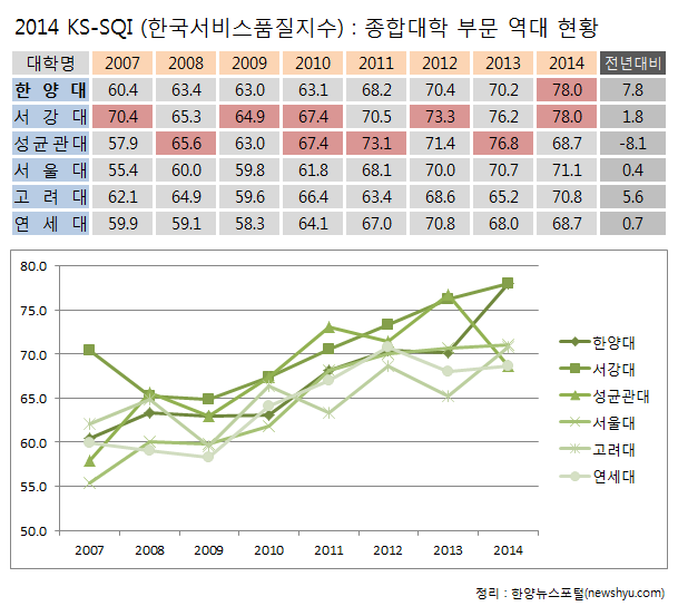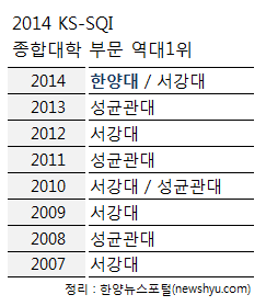 한양대학교가 '2014 한국서비스 품질지수(KS-SQI)'평가에서 종합대학교 부문에서 1위를 차지했다. 한양대는 종합대학교 업종 평균인 72.6점 대비 5.4점 높은 78점을 받았으며, 서강대학교와 공동 1위다.