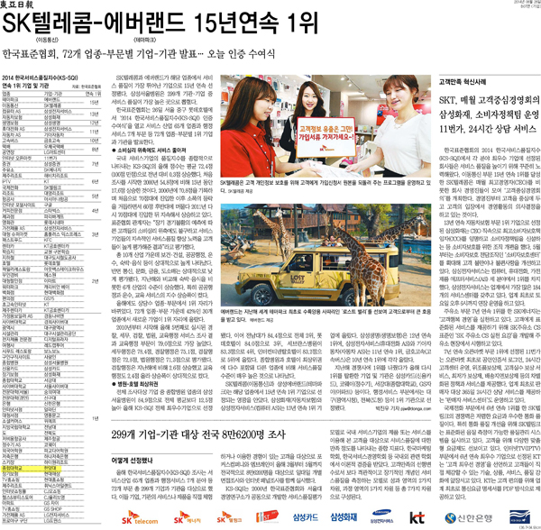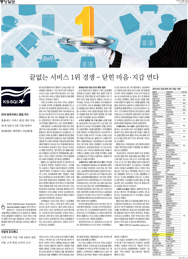 한양대 1위 선정 소식에 더하여 '2014 한국서비스품질지수'에 관련한 자세한 소식은 26일자 <중앙일보>, <동아일보>, <매일경제>, <한국경제>에 실리기도 했습니다.