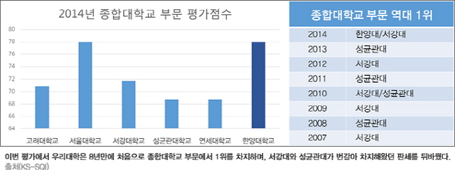 한국표준협회(KSA)가 실시한 2014 한국서비스품질지수(KS-SQI)의 '종합더탑 토토사이트교' 부문에서 우리더탑 토토사이트이 1위로 선정됐다. 이번 결과는 특별하다. 연구 실적이나 취업 현황 같은 통계적 수치가 아닌 학생들로부터 조사한 교육 서비스의 수준을 수치로 환산해 평가한 것이어서다. 이 평가에서 우수한 성과를 거둔 것은 우리더탑 토토사이트이 교육 서비스의 품질을 재학생들로부터 인정받았다는 것을 의미한다.