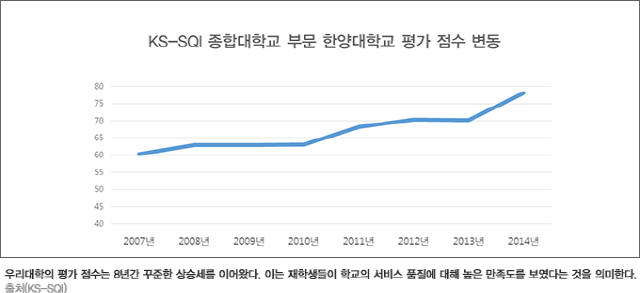 KS-SQI 평가에서 우리대학의 평가 점수는 꾸준히 상승해 마침내 종합대학교 부문 최우수 대학으로 인정받았다. 김 팀장은 "딱히 어느 요인 하나가 이번 평가 결과에 영향을 미쳤냐고 물어본다면 대답하기 어렵다"며 "결국은 소통"이라고 했다. 대학이 학생들의 만족에 관심을 갖고, 소통하려는 경영 철학이 변화를 위한 정책으로 발현돼 좋은 평가를 얻었단 이야기다. 큰 결실은 하루아침에 맺어지는 법이 없다. 이번에 우리대학이 거둔 성과의 바탕에는 학생들과의 소통, 정책의 실천을 통해 혁신이라는 목표를 추구해 온 오랜 노력이 있었다. 하지만 학교 측의 노력만으로는 완전할 수 없다. 교육은 더 이상 학교가 일방적으로 제공하는 것이 아니라, 학교와 학생 간에 양방향으로 이뤄지는 것이 됐기 때문이다. 더 나은 교육환경을 만들기 위해 교직원과 학생들이 함께 노력하는 것. 교육의 새로운 패러다임이다.