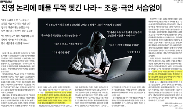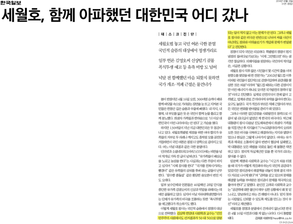 29일자 <한국일보>의 또다른 기사에서 김상학 사회학과 교수는 "선진 민주주의 사회에서도 선거결과가 50대 50으로 양분되는 일이 적지 않고 이는 문제가 안 된다. 그러나 세월호 참사와 같은 비극은 반반으로 나뉘어 싸울 사안이 아닌데도 정파와 이데올로기가 개입돼 문제가 변질됐다"고 진단했습니다.