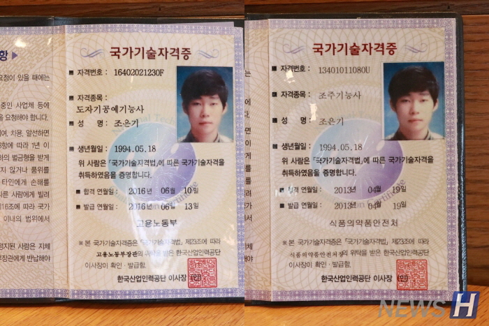 도자기공예기능사는 이틀동안 실기 시험을 친다. 첫날엔 물레를 돌리고 도자기를 잘 말려주면, 다음 날에 도자기를 성형하고 유약 칠한 후 다시 구워서 완성본을 만든다. 100점 만점 중 60점 이상 맞으면 합격이다. “시험문제로 원통형 함이 나왔는데, 뚜껑까지 만들어야 해서 난이도가 높아요. 80점을 넘겨서 다행히 붙었죠.“ 채점에서 가장 중요한 것은 도자기 도면의 벽 두께다. 완성작의 두께가 기준에서 1cm 이상 넘어가면 실격, 1mm 오차마다 1점씩 감점된다. “1년 동안 연습하던 공방에서 알려준 유용한 팁이 있는데, 미리 5cm 남짓의 핀을 준비해가요. 기준 두께가 0.5cm로 출제되면 핀을 찔러보고 튕겨 나오면 흙을 더 깎고, 안 튕기면 더 쌓는거죠. ”