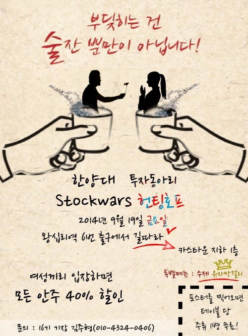 다음은 각 과 주점을 비롯해 크고 작은 행사 홍보 토토사이트 가입 불법 중에서 눈길을 끄는 것들을 모아봤다. 토토사이트 가입 불법들은 각 학과의 특징을 담거나 요즘 유행하는 다양한 이미지를 패러디하여 보는 이를 즐겁게 해준다.