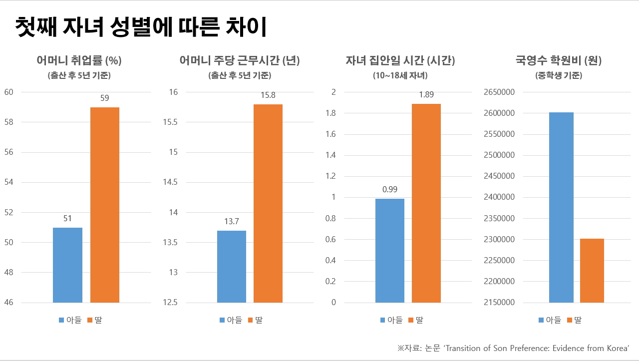 이외에도 아들을 가진 부모는 딸을 가진 부모보다 성적이 떨어졌을 때 학원비 지출을 더 많이 늘린다는 것과 아들을 낳은 부모는 딸을 낳은 부모보다 자식 학력이 0.3년 정도 더 길기를 기대한다는 연구결과도 확인됐다.