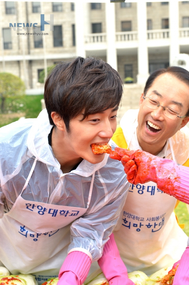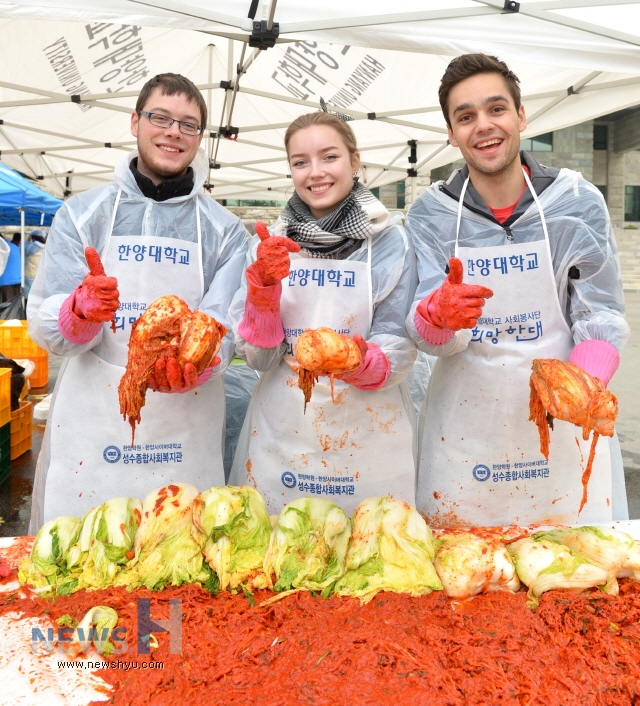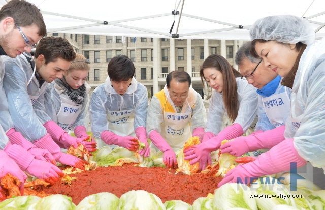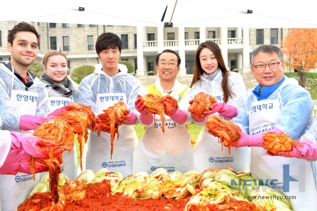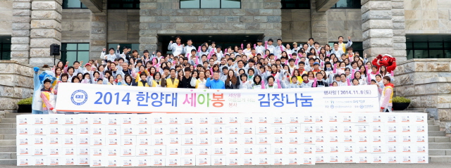 한양대 사회봉사단(단장 김용수)이 교내 외국인학생들, 동문 배우 정일우‧최여진, 교직원‧학생, 성수종합사회복지관 관계자 등 200여명과 함께 서울 성동구 취약계층의 겨울나기를 돕기 위해 8일 교내 본관 앞에서 ‘세아봉(세상을 아름답게 하는 봉사) 김장나눔’ 행사를 열었다. 한양대는 가구당 10kg씩 성동구내 600여 가구에 김장 김치를 배달할 예정이다.