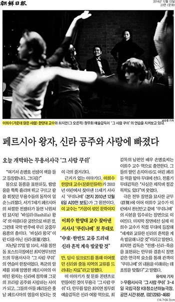 3일자 <조선일보>에는 무용서사극 '그 사람 쿠쉬'에 대한 기사가 게재되었습니다. '그 사람 쿠쉬'는 이희수 문화인류학과 교수가 이란에서 찾아낸 11세기 서사시 '쿠쉬나메'를 원전으로 하는 서사극인데요. 이 교수는 '쿠쉬나메'에 대해 "가공이 섞인 문학이지만, 당시 실크로드를 통해 이어졌던 신라와 중동 지역의 교류를 드러내는 자료"라고 설명했습니다. 이 이야기가 문화콘텐츠로 만들어진 '그 사람 쿠쉬'에서는 이희수 교수가 '쿠쉬나메' 사본을 입수하는 장면이 나올 뿐만 아니라 그가 직접 무대에 등장해 "세계와 교류한 신라의 흔적을 계속 발굴해 나갈 것"이라고 전할 예정이라고 합니다.