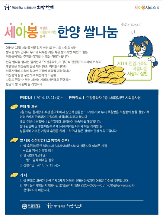 2014년 한 해를 마무리하는 12월, 세아봉(세상을 아름답게 하는 봉사)에서 특별한 행사를 마련했다. 지난 11월 성동구 취약계층의 겨울나기를 돕기 위한 김장나눔 행사에 이어 이번에는 세아봉 시리즈 4탄 쌀나눔 판매 행사를 준비했다. 이번 ‘한양 쌀나눔’은 두 가지 형식으로 진행된다. 먼저, 성금만 납부해 쌀을 후원하는 방식이다. 다음으로 쌀을 신청해 사는 방법이다. 쌀을 신청하면, 지난 9월 29일 함께한대 주관 음악회에서 장근석 팬클럽 ‘크리제이’로부터 후원받은 최상품 쌀을 해당 가정집으로 배달해준다. 이번 행사로 모금된 성금은 제3세계에 속하는 어려운 나라와 성동 지역의 어려운 가정을 위해 사용된다.
